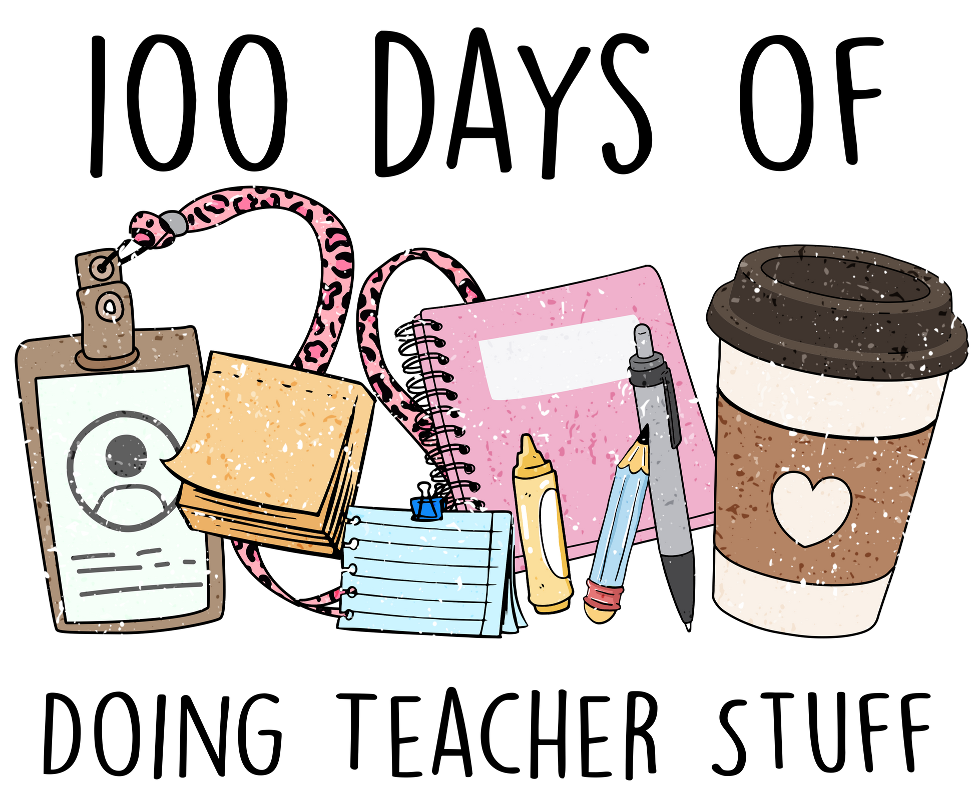 This relatable teacher design celebrates 100 days of doing all the "teacher stuff"! Featuring adorable illustrations of essential teacher items including an ID badge with pink leopard lanyard, a book, pink notebook with pens, sticky notes, and of course - a coffee cup with a heart. The perfect shirt for teachers who've survived 100 days of organized chaos!