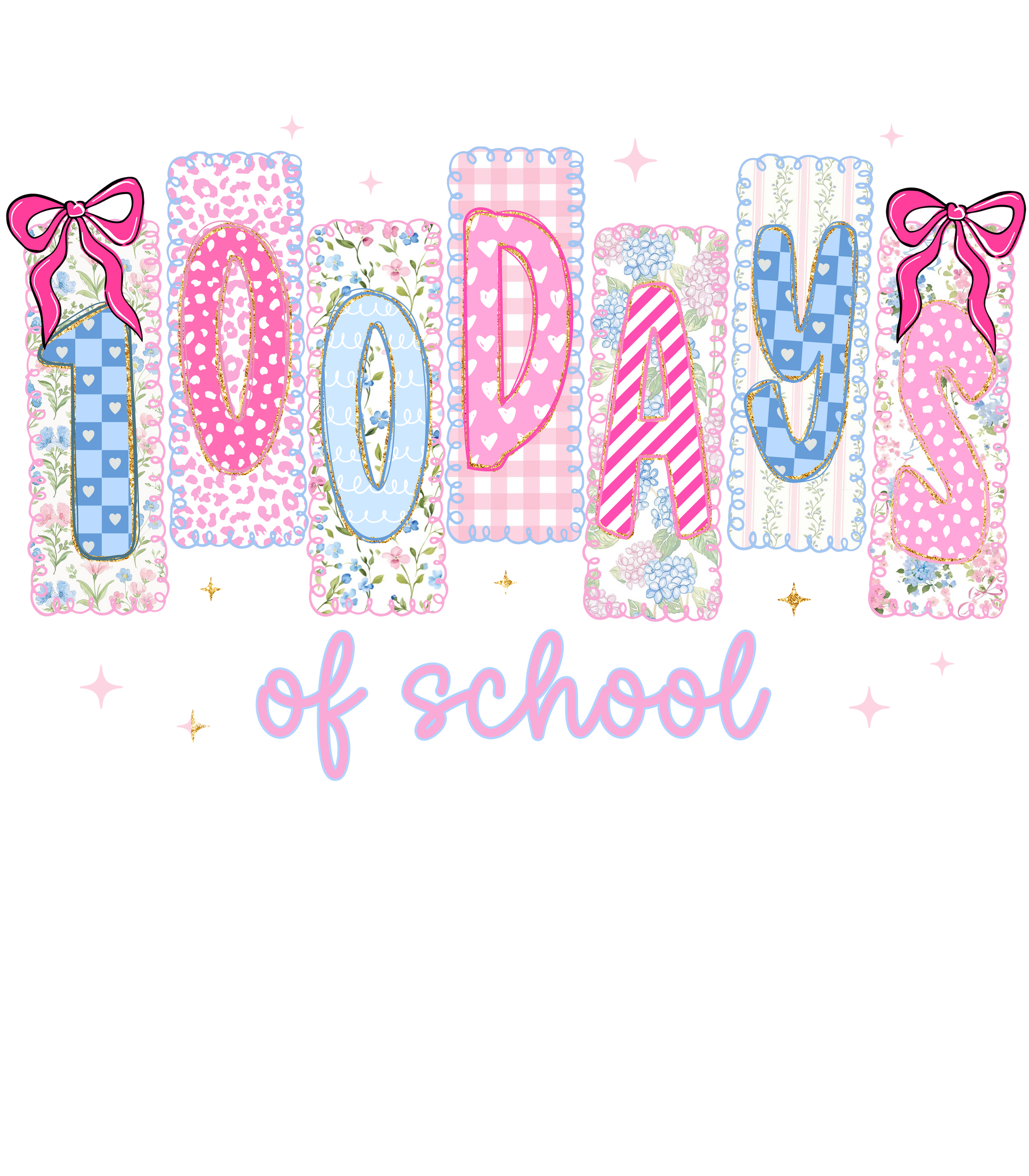 This charming 100 Days of School design features adorable patchwork-style letters in soft pink and blue tones with delicate floral and heart patterns. Topped with sweet pink bows on each side, it's the perfect blend of shabby chic and school spirit!
