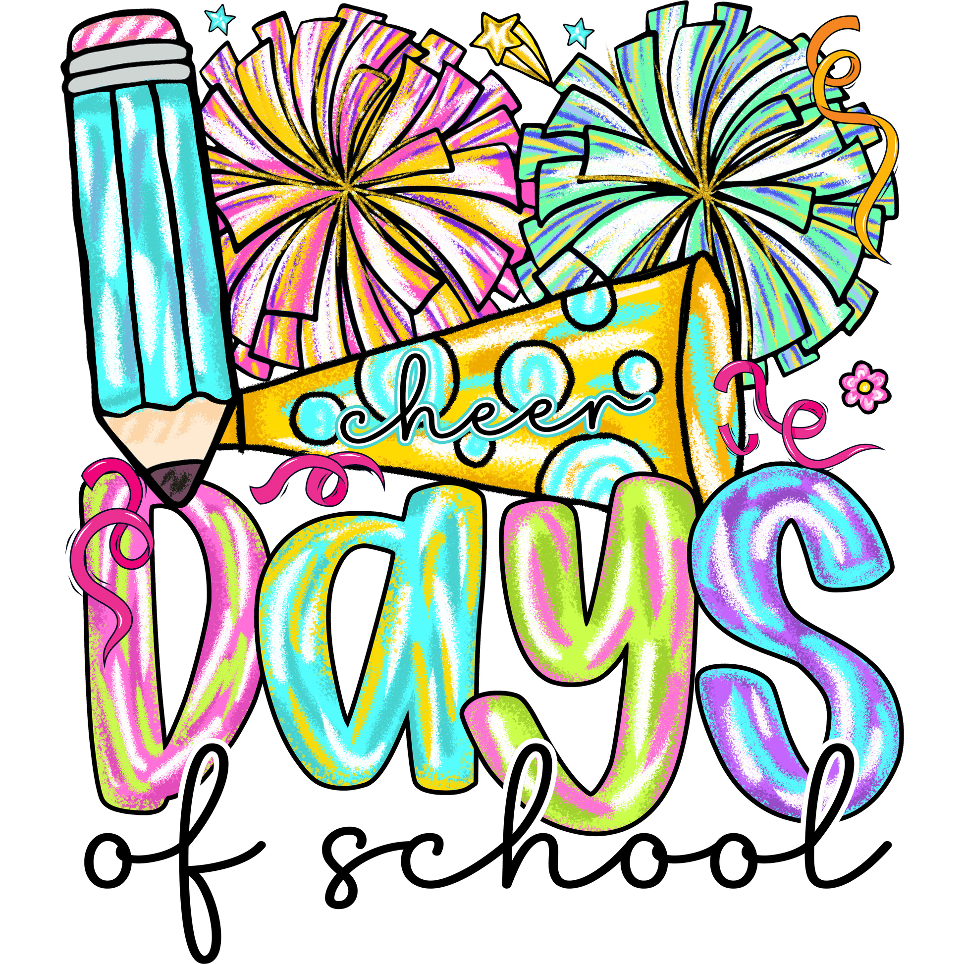 This vibrant 100 Days of School design is perfect for cheerleaders and spirit-filled students! Featuring bold rainbow-colored "DAYS" letters with a glittery, textured look, colorful pom-poms bursting with energy, a giant pencil, and playful stars. Available in two color options for "of school" - choose classic black or bright turquoise!